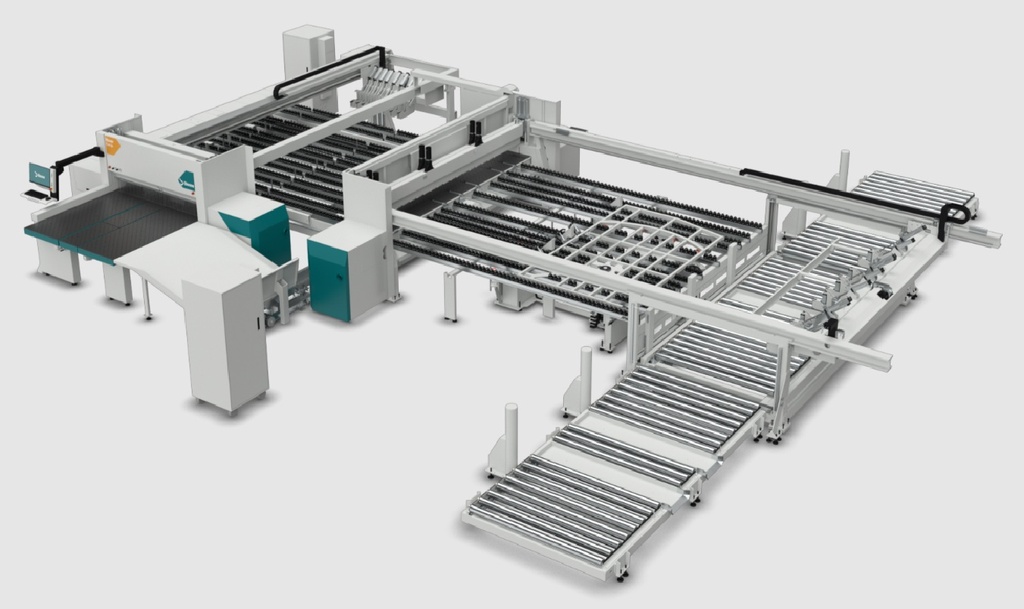 Efficient process, high productivity: rip and cross cut in one step. Two independent and synchronized cutting lines powered by a lift table loading system. Perfect solution for volume productions, cutting panels in books.