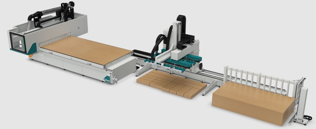 Autonomous machining center for panels application, ensuring optimized time cycle Less effort for the operator during the process, resulting in more productivity of the nesting cell. Perfect fit for companies seeking for autonomy in process and optimized manpower.